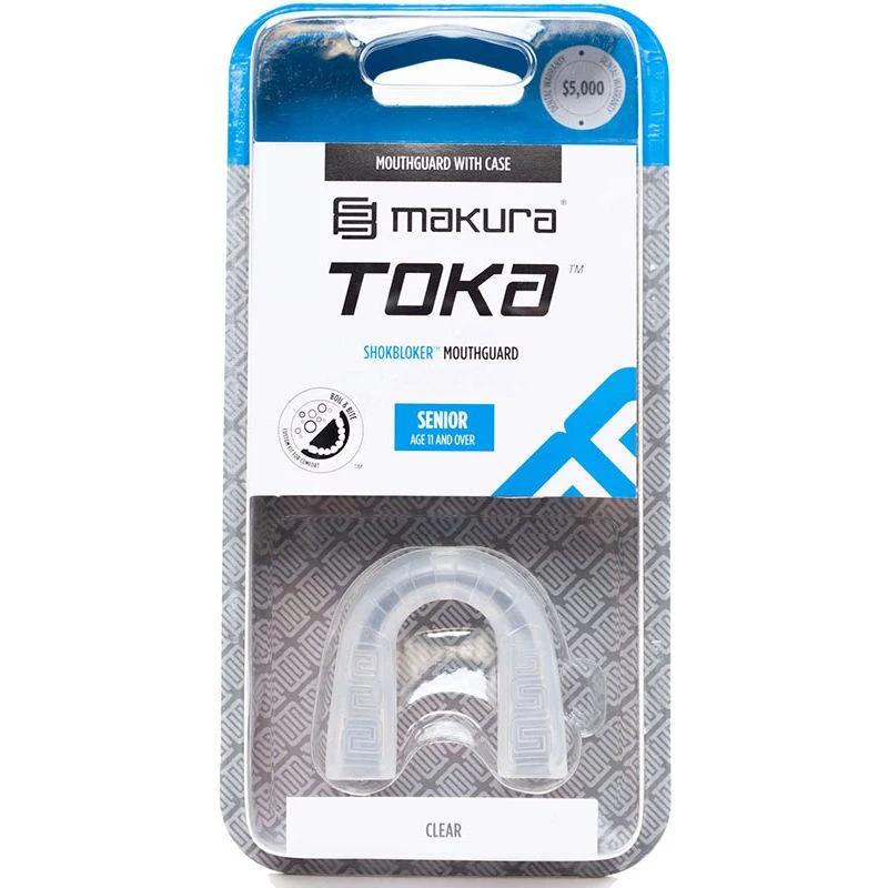 Makura’s TOKA gebitsbeschermer is een 1-laags bitje met een stevige SHOKBLOKER ™ body voor perfecte bescherming. De BOIL & BITE ™ technologie zorgt voor veilige pasvorm en onmiskenbaar comfort. De TOKA gebitsbeschermer is vrij van latex, heeft een lucht doorlatend kanaal voor verbetering van de ademhaling als de kaak gesloten is en antislip kussentjes aan de onderkant om te voorkomen dat de beschermer wegglijdt.